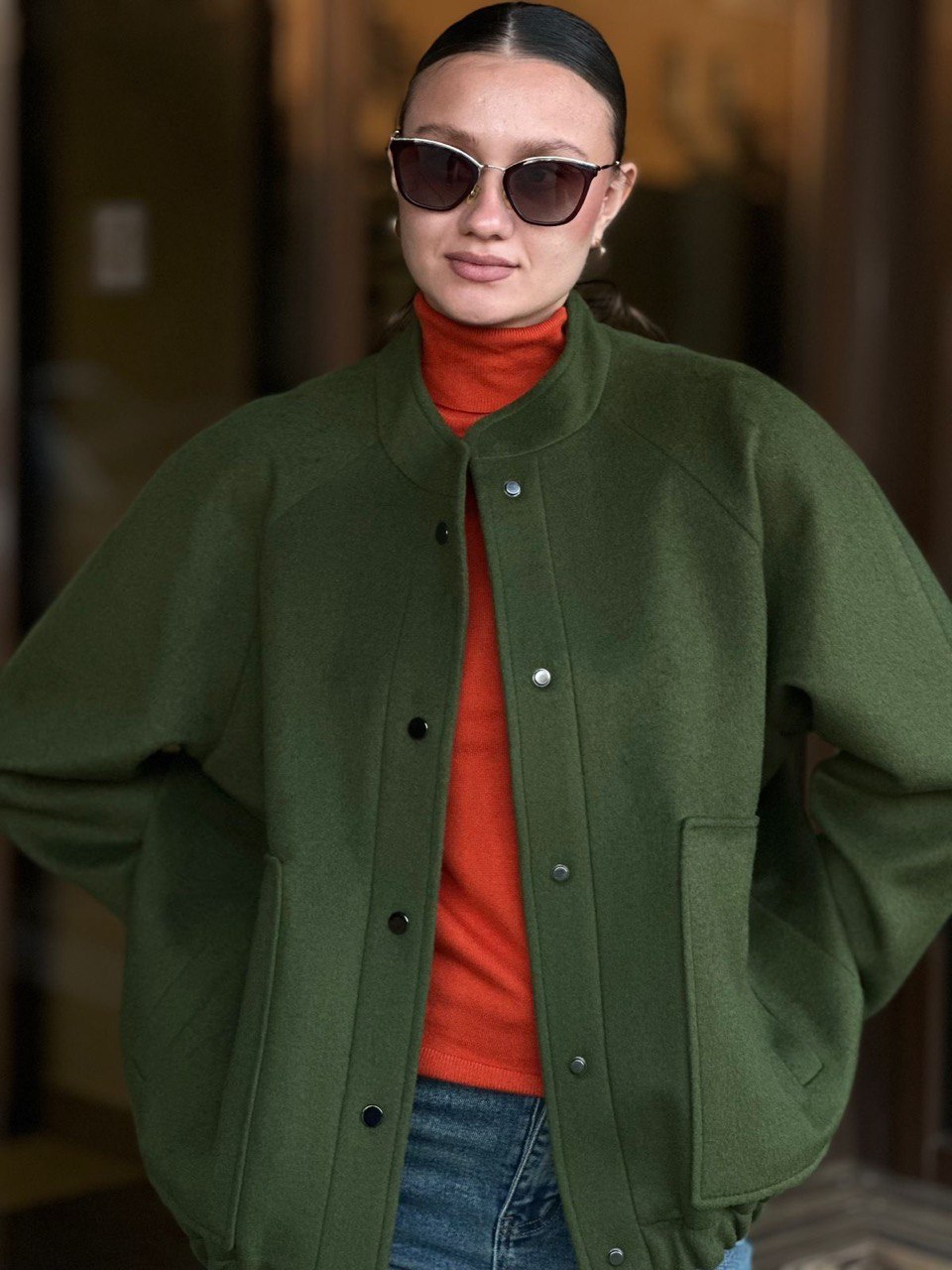 Полупальто бомбер на кнопках. Рукав реглан, воротник стойка, накладные карманы с листочкой. Длина 65 см