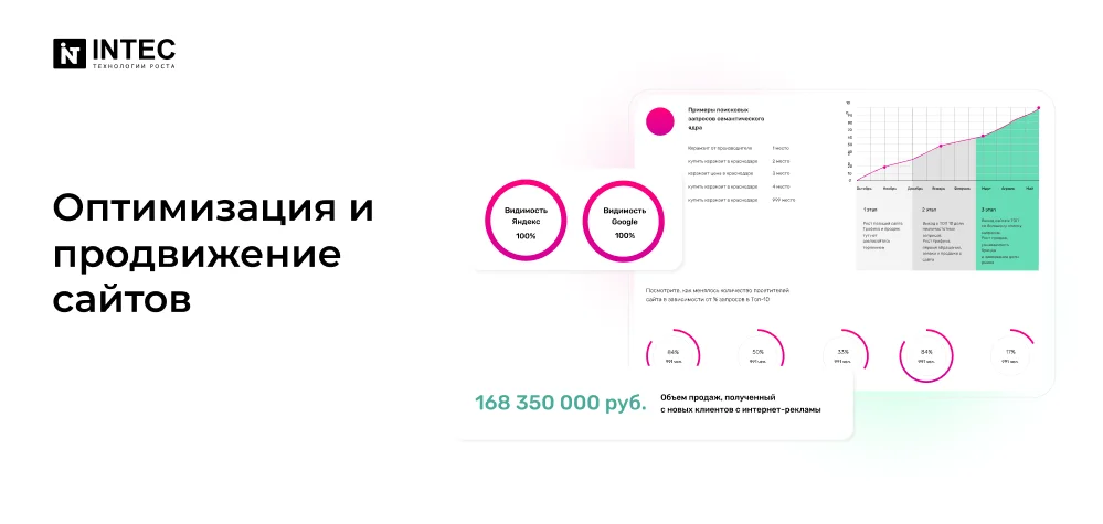 Разработка сайта — это лишь первый шаг. Для привлечения целевой аудитории и повышения продаж необходимо профессиональная seo-оптимизация и продвижение. Digital-агентство INTEC предлагает полный комплекс услуг по оптимизации и продвижению сайтов: